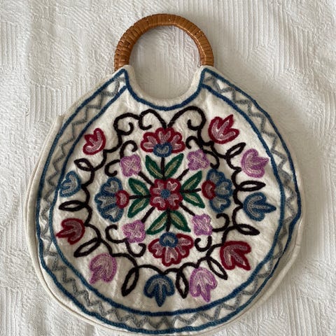 En klassisk handstickad axelremsväska från AIAYU design Helen Chain i färgen wheat. Väskan är på insidan helfodrad och med försedd dragkedja. Remmen är av guldfärgad metall. Väskan är använd vid ett tillfälle och är i helt perfekt nyskick.