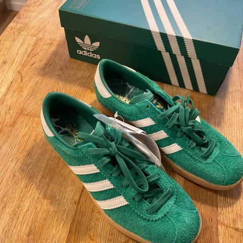 Adidas Spezial sneakers i storlek 36. Skorna är i brun färg med vita ränder och detaljer samt gummisula i naturfärg. Ovandel i mockaliknande material med snörning framtill.