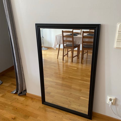Säljer en stilren spegel med svart ram som passar perfekt i hall, sovrum eller vardagsrum.