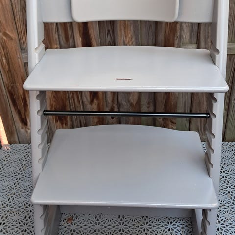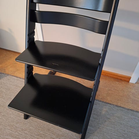 Stokke Tripp Trapp matstol i svart trä. Klassisk barnstol med justerbar sittplatta och fotstöd som kan anpassas efter barnets längd. Använd till ett barn, viss mindre slitage (se bilder) men i övrigt rejäl och stabil.
