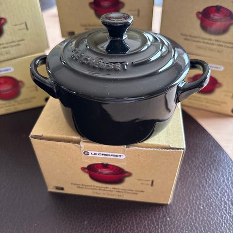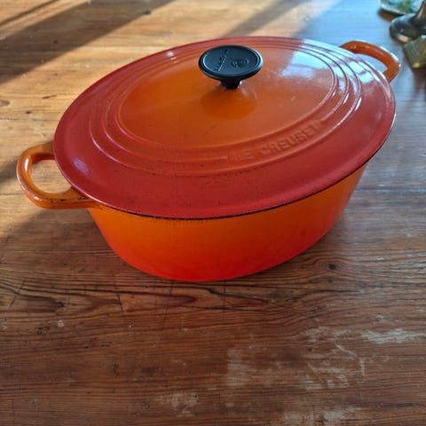 Le Creuset gryta i gjutjärn med emaljerad insida. Färg i orange/röd nyans med svart knopp på locket. Grytan har två handtag och rund form. Invändig emalj är ljus med synliga bruksspår. Lämplig för matlagning på spis och i ugn, exempelvis grytor, soppor och långkok.