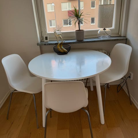 Runt matbord med vit bordsskiva i MDF och ben i massivt trä.