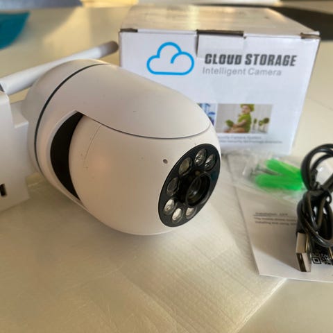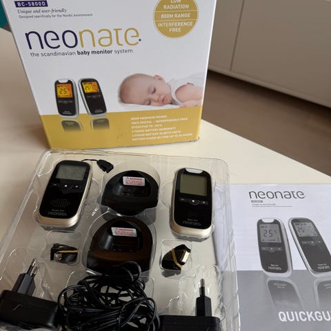 INF babyvakt med kamera och 5" HD-skärm i vit färg. Systemet består av en övervakningskamera och en separat bildskärm samt strömadapter och kabel. Kameran är avsedd för övervakning av spädbarn eller barn i hemmet och kan placeras i barnets rum för visuell och ljudbaserad kontroll. Skärmen visar livebild från kameran och kan användas för att följa barnets aktivitet och sömn från ett annat rum.