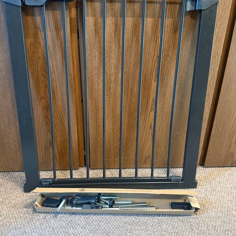 En barngrind i fin skick från Babydan flex XL med en extra sektion. Det vill säga 4 större inkl dörr samt två mindre delar med väggfästen och skruvar. Totallängd ca 370cm.