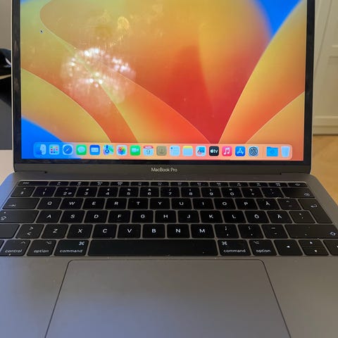 Apple MacBook Pro laptop i grå färg. Bärbar dator med skärm, tangentbord och stor styrplatta i unibody-konstruktion av metall. Lämplig för vardagsanvändning, studier och kontorsarbete. Utrustad med inbyggd webbkamera, högtalare och flera anslutningar på sidorna.