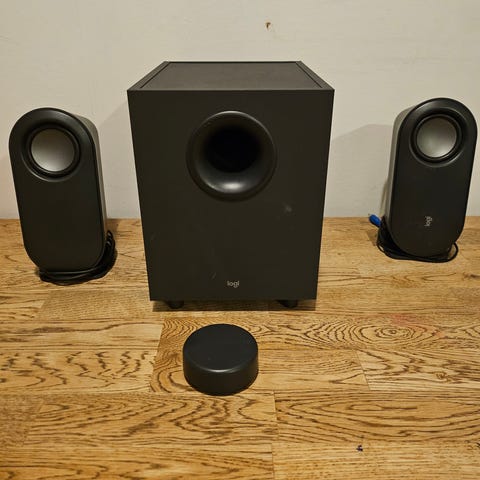 Logitech högtalarset 2.1 i svart färg. Består av två satellithögtalare och en subwoofer. På ena satellithögtalaren finns reglage för volym och bas samt anslutning för hörlurar. Systemet är avsett för användning med dator, TV eller annan ljudkälla med kompatibel anslutning och ger stereoljud med separat baslåda för förstärkt basåtergivning.