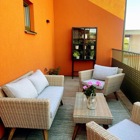 Trädgårdsgrupp med rektangulärt bord och två stolar i grå färg. Bordet har metallstomme och bordsskiva i ribbad design. Stolarna har metallstomme med textilklädd sits och rygg samt armstöd. Passar för uteplats, altan eller trädgård som sittgrupp för måltider och avkoppling utomhus.