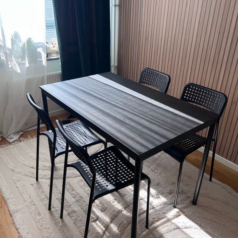 Säljer en jätte fin matgrupp hägernäs från Ikea knappt använt med 4 stolar + 4 gråa sittdynor till stolarna + en jättefin matta till köksbordet nypris för bord och stolar 1990kr nypris för mattan 600kr mitt pris för allt 1000kr eller kom med pris förslag säljer allt för att vi skall kolla på ett runt matbord från Ikea istället