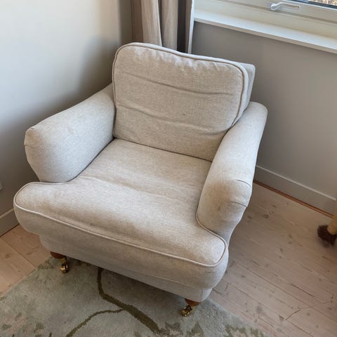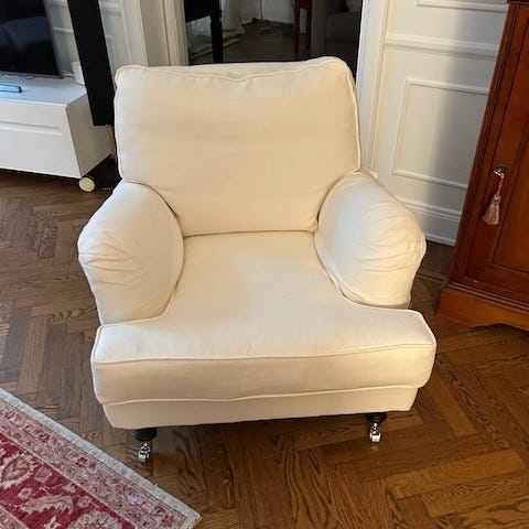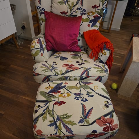 Säljer en otroligt vacker fåtölj från Englesson klätt i tyg från DESIGNERS GUILD. Fåtöljen är sliten på armstöden och uppe till det högra hörnet (se bild). Två stycken armskydd medföljer som täcker slitaget. Annars är fåtöljen helt felfri.