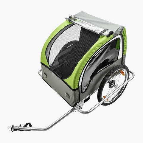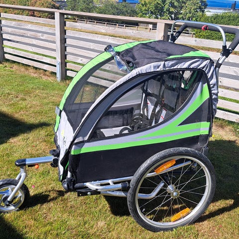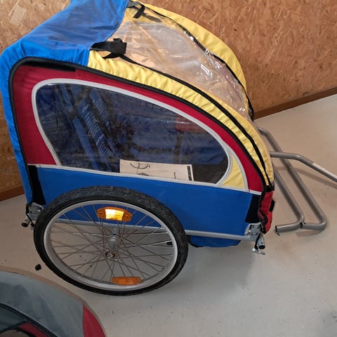 Croozer cykelvagn i blått och svart med genomskinligt fönster framtill. Vagnen har två hjul bak och dragstång framtill för montering på cykel. Lämplig för transport av barn eller packning vid cykelturer. Konstruktion med metallram och tygöverdrag med plastfönster som skydd mot väder. Går att göra om till vanlig vagn med hjul som medföljer. Priset kan diskuteras vid snabb affär!