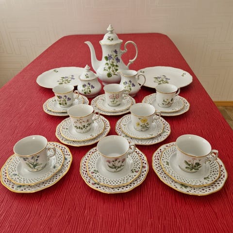 10 koppar, 12 fat, sockerskål, gräddsnipa och kaffepanna