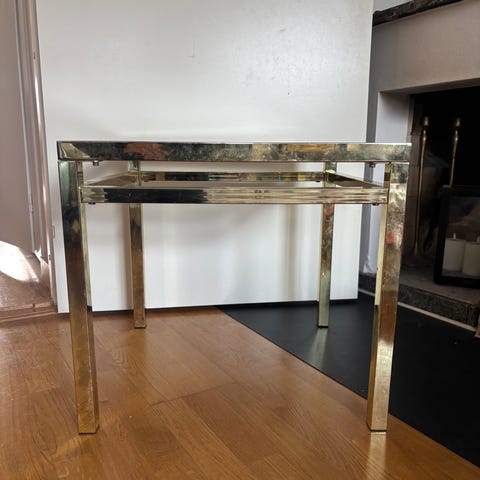 Säljer ett mycket elegant bord med stilren glasskiva och guldfärgat underrede. Bordets klassiska design med dekorativa detaljer ger ett exklusivt och tidlöst uttryck.