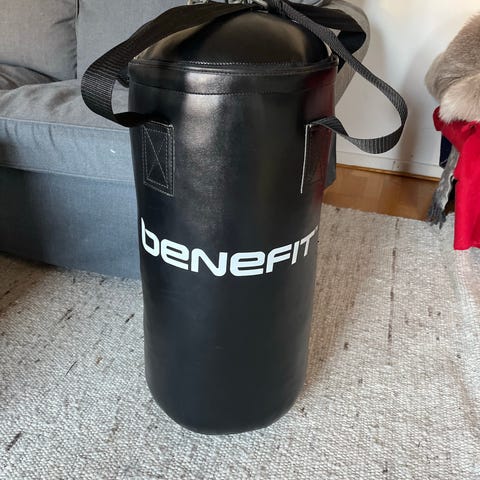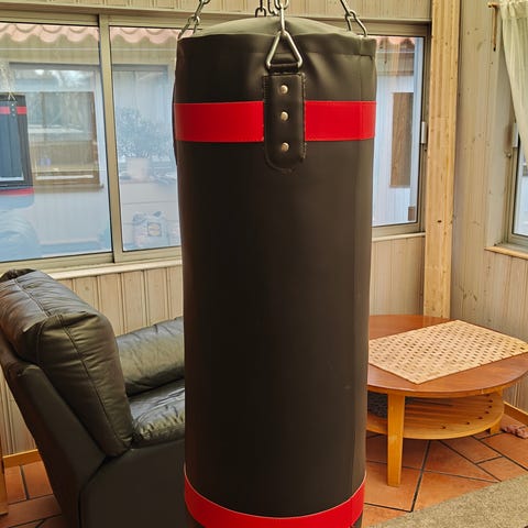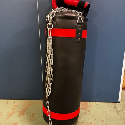 Boxningssäck i svart och röd färg med upphängningskedja.