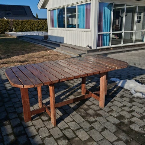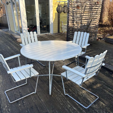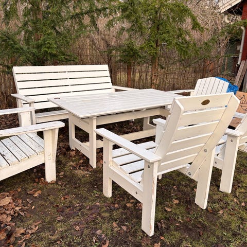 Trädgårdsgrupp i trä. Soffa, två fåtöljer och ett bord. I behov av tvätt och ev ommålning. Annars i fint skick. Hämtas I gäddeholm.