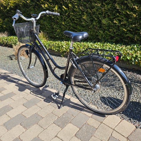 Crescent stadscykel för kvinna med 26" hjul. Cykeln har klassisk ram med lågt insteg, pakethållare bak och korgfäste fram. Utrustad med brun sadel och upprätt körställning som passar vardagscykling i stadsmiljö. Lämplig för kortare och medellånga turer på asfalt och cykelvägar.