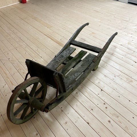 Skottkärra i trä med ett hjul framtill. Det originala hjulet medföljer. Konstruktionen består av träbalja och trähandtag, med metallfälg och däck. Lämplig för utsmyckning endast. Skottkärran förvaras under tak enligt bilderna.