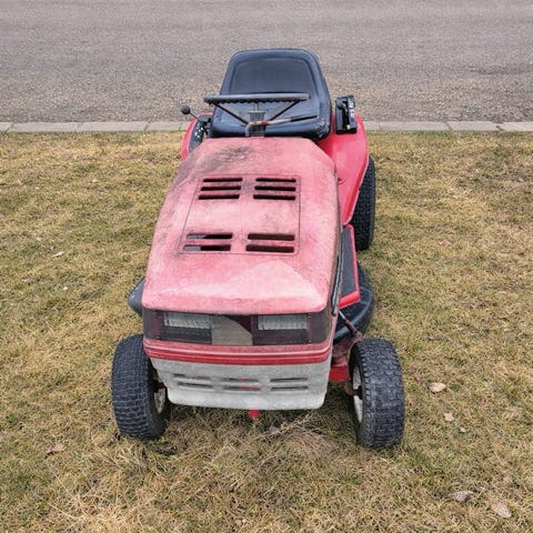 Yard-Man TE4125 åkgräsklippare med klippbredd 91 cm. Modellen har gul och grön kaross med sits och ratt för förarplats. Bensindriven motor fram och klippaggregat monterat under maskinen. Lämplig för klippning av gräsmattor och större grönytor där åkgräsklippare behövs.