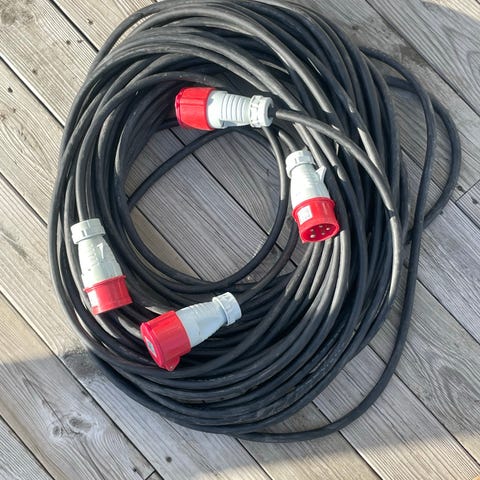 Förlängningskabel för trefasanslutning med röd kontakt. Kabeln har rund stickpropp och motsvarande skarvuttag med lock. Lämplig för anslutning av trefasutrustning i exempelvis garage, verkstad eller byggarbetsplats där längre räckvidd behövs mellan eluttag och maskin eller verktyg.