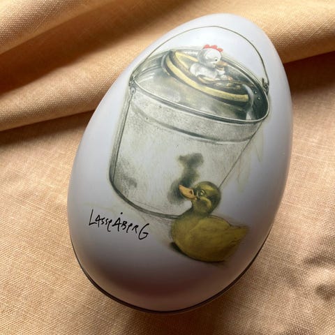 Charmigt vintage påskägg i plåt med motiv efter en litografi av Lasse Åberg. På ägget syns en av Åbergs klassiska figurer – en gul ankunge som håller en skylt med texten “Ropen skalla – ägg åt alla!”. En lekfull och typisk illustration i Lasse Åbergs stil.