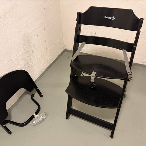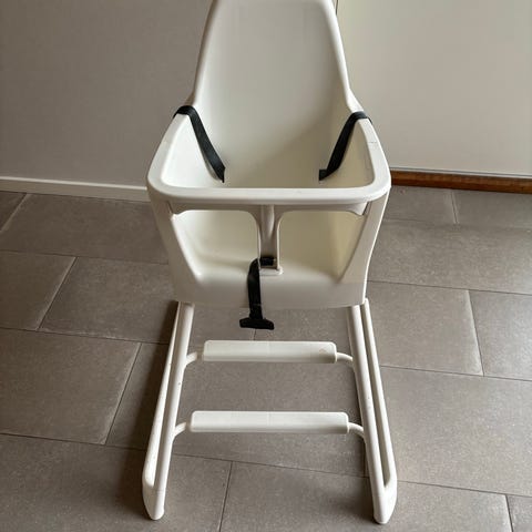 IKEA matstol för barn i vit plast med metallben. Stolen har inbyggd sittdel med ryggstöd och avtagbar bricka framtill. Utrustad med säkerhetsbälte/rem mellan benen för att barnet ska sitta stadigt. Lämplig som matstol vid köksbord eller matplats för små barn som behöver sitta upphöjt vid måltider.