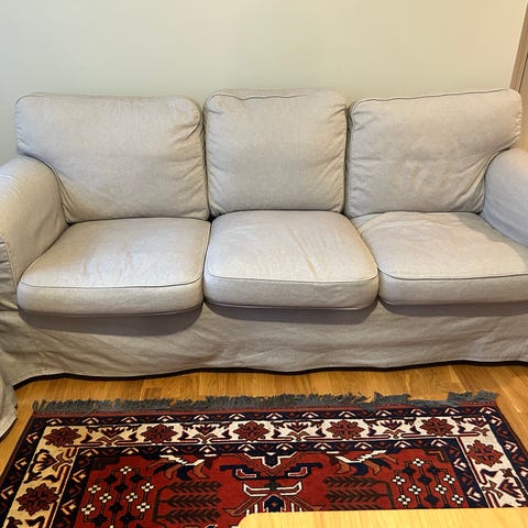 Inköpt dec-25, sparsamt använd, inga barn eller djur i familjen. Mått soffa: längd 218cm, djup 88, sittdjup 49, Fotpall längd 82, bredd 62 och höjd 44.