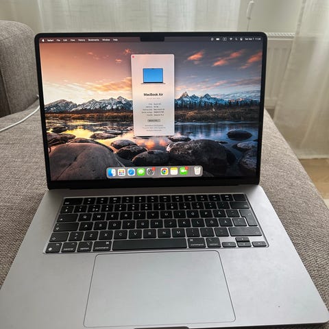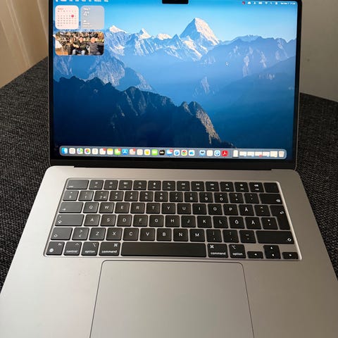 Apple MacBook Air 15 tum laptop med Apple M3‑krets, 8 GB unifierat minne och 256 GB SSD‑lagring. Modellen har 15,3-tums Liquid Retina-skärm, bakgrundsbelyst tangentbord och Force Touch-styrplatta. Utrustad med 1080p FaceTime HD‑kamera, tre inbyggda mikrofoner och fyrhögtalarsystem med stöd för rumsligt ljud. Anslutningar inkluderar två Thunderbolt / USB 4-portar, MagSafe 3-laddningsport samt 3,5 mm hörlursuttag. Enheten kör macOS och är i svart färg (midnatt).