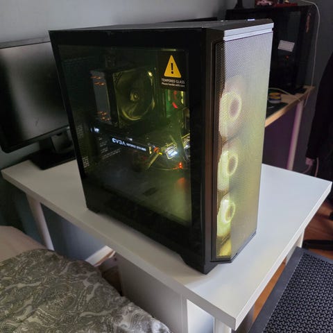 Datorchassi för stationär dator med plats för ATX‑komponenter. Chassit är svart med genomskinlig sidopanel i härdat glas som visar insidan. Framtill finns tre förmonterade fläktar. Överkanten har ventilationsgaller för bättre luftflöde. Lämpligt för montering av egen stationär dator med standardkomponenter. Exakta mått, modellnamn och materialspecificeringar är inte angivna.