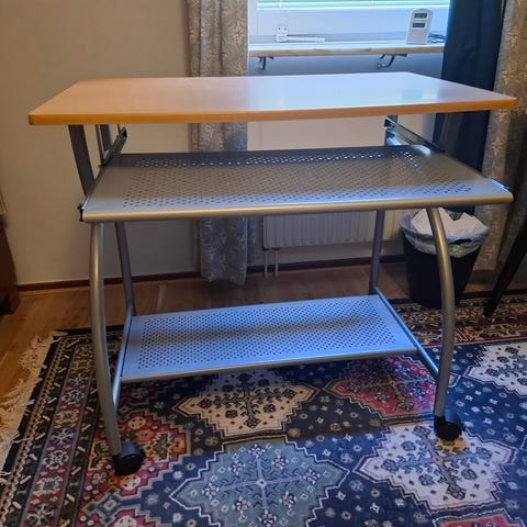 Litet datorbord Konstfanér och stål. Med mugg- och hörlurshållare. B60 x L120 x H74 cm 700kr