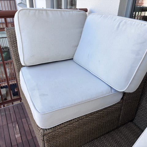 Trädgårdsdynor med hög rygg i tyg med blommigt mönster i vitt, rött och gråbeige. Dynorna är vadderade och har knappar samt band för fastsättning på stol. Passar i hammock eller andra utemöbler där man önskar extra sitt- och ryggkomfort. Baksidan på dynorna är enfärgat vit plast med knappstoppning.