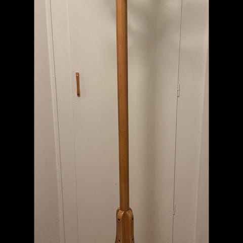 Lika mycket en inredningsdetalj som vacker och användbar. Metall och mässing - 174 cm hög. Fyra krokar upptill och fyra krokar mitt på. Överdelen är snurrbar (avtagbar). Från 1900-talets mitt men i mycket gott skick givet sin ålder.