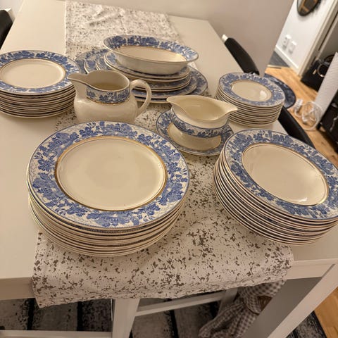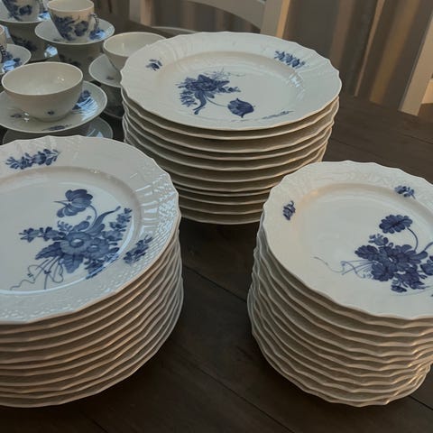 Royal Copenhagen tallrikar i porslin med blå kant och dekor. Tallrikarna har vit mitt och blå bård med mönster längs kanten. Undersidan är stämplad med Royal Copenhagen-märke och numret 605. Passar som mat- och serveringstallrikar i dukningar där man vill ha klassiskt porslin med färgad kant.