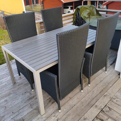Matgrupp bestående av rektangulärt bord och 6 stolar. Bordsskivan är i trä med ribbad yta och benen i metall. Stolarna har svart metallstomme med sits och rygg i svarta ribbor/snören. Passar som matgrupp i inglasat uterum/altan.