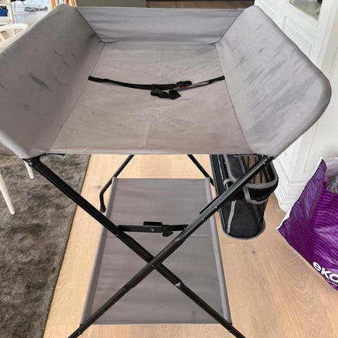 Ihopfällbart skötbord i grått från märket babycare. Knappt använt och rengjort, tyvärr ett märke på tyget som inte går bort (se bild). Nypris verkar ligga runt 700-1000kr.