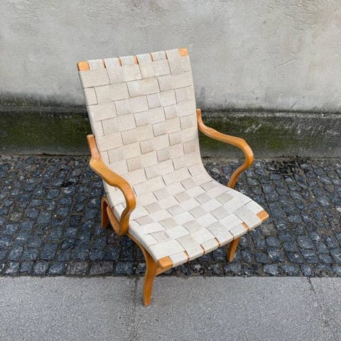 Alvar Aalto fåtölj 406, björk och sadelgjord I natur. En del av sadelgjorden har slitits och behöver bytas ut, se bild. Hämtas i Malmö.