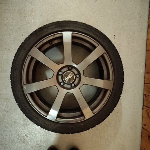 JR SL02 18x9 5x114,3 ET40 med Valino semislicks på. Däcken ser inte ut som de rullat så många km. 12 000kr.