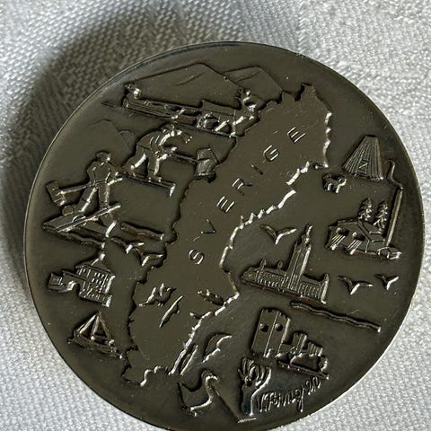 Ring med runt blått emaljfällt motiv med tre kronor. Silverfärgad ring med slät insida. Storlek på ringen är 22 mm innermått