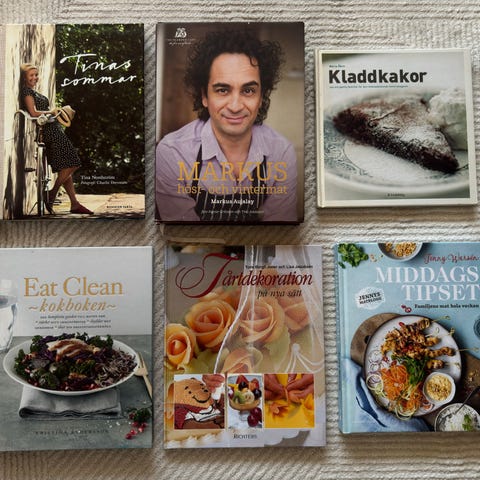 Paket med tre kokböcker. En bok med vardagsmat utan gluten och mjölk, en bok med recept med fokus på hållbarhet och förändring samt en allmän kokbok med blandade recept. Böckerna innehåller recept, tips och inspiration för matlagning i hemmet, inklusive alternativ för personer som vill undvika gluten och mjölk.