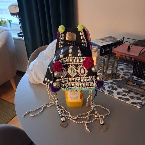 En härlig mössa i grönt, grått, rött och vinröd från Tiger. Den är tillverkad av 33% mohair 22% lammull och 26% nylon. Den är i fint skick och självklart äkta.