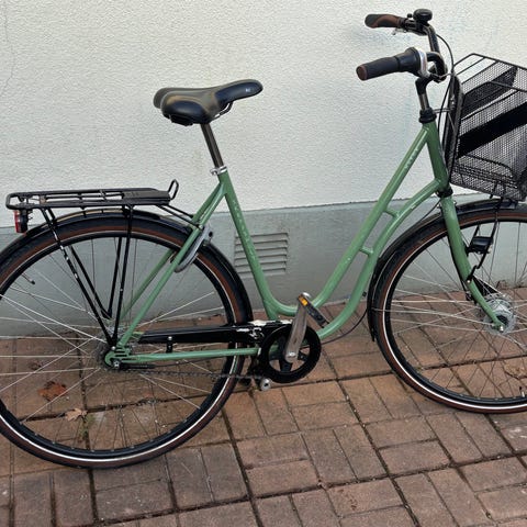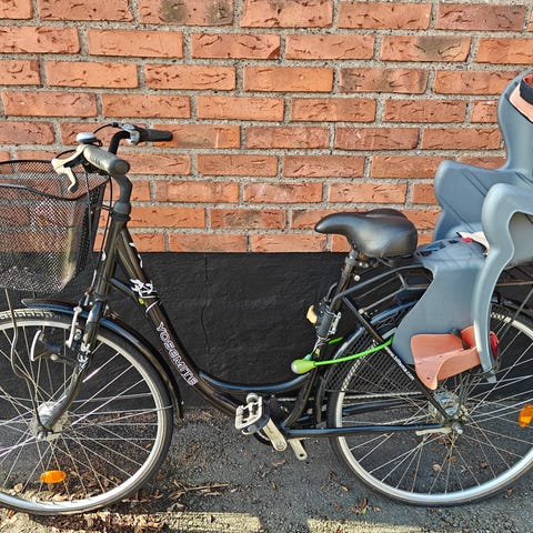 Skeppshult natur damcykel 3-växlad. Kvitto finns, köptes i höstas på Cykelmecken för 3.900kr och har använts 1-2 gånger sen dess då min son inte ville åka med och den sen inte använts. Köpt nyservad och stått under tak sedan dess. Ny barnstol från Thule (nypris cirka 1.000kr). Säljes som färdigt paket.