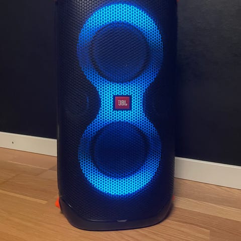 JBL partyhögtalare i svart färg. Portabel modell med hjul och handtag för enklare förflyttning. Inbyggda reglage på ovansidan för volym, uppspelning och anslutningar. Lämplig för musikuppspelning vid till exempel fester, sammankomster eller andra tillfällen där kraftigare ljud behövs.