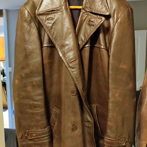 Jag säljer tysk herr läder kappa 40-talet med rävpälsfoder.