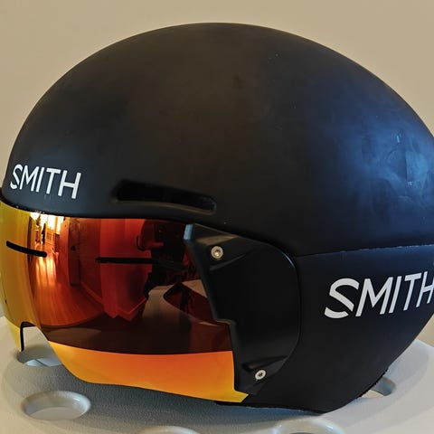 Rudy Project cykelhjälm med aerodynamisk design och integrerat visir. Hjälmen är vit med diskreta grå detaljer och har svart insida med röda kuddar. Justerbart innersystem och remmar för bättre passform. Lämplig för landsvägscykling och tempo-/triathlonbruk där låg luftresistens och bra sikt är viktig.