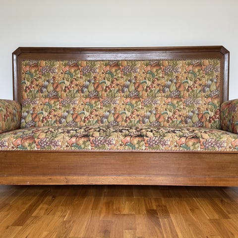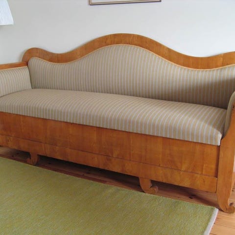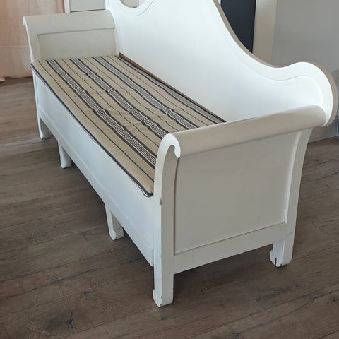En mycket vacker äldre kökssoffa som blivit fint omklädd i grönt underbart tyg. Soffan har spår av tidens tand vilket syns väl på bilderna. Går att bygga om till säng omså önskas. Måtten som angetts är de yttre (höjden med små knoppar något högre 112+5,5cm)
