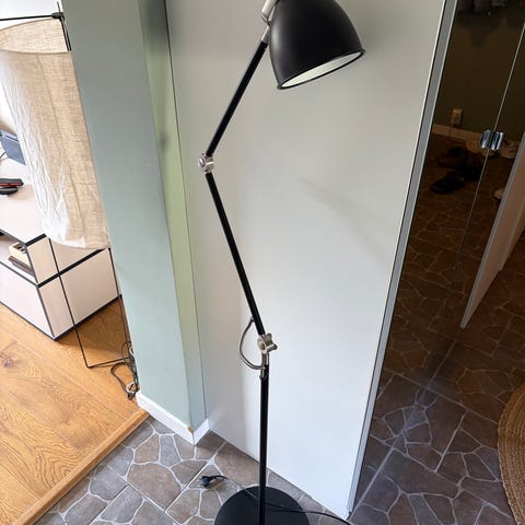 IKEA golvlampa i svart utförande. Lampan har ett runt lamphuvud monterat på en smal, justerbar stång med rund fot. Passar som belysning i vardagsrum, sovrum eller arbetsplats. Strömbrytare sitter på sladden. Ljuskälla ingår normalt inte utan väljs efter önskad ljusstyrka och typ av sockel enligt märkning på lampan.