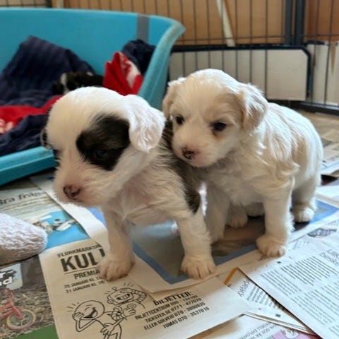 Underbara kärleksfulla valpar som nu är 5 veckor gammla söker efter ett kärleksfullt o tryggt hem. Valparna är födda den 1 februari. Båda valparna är hanar.