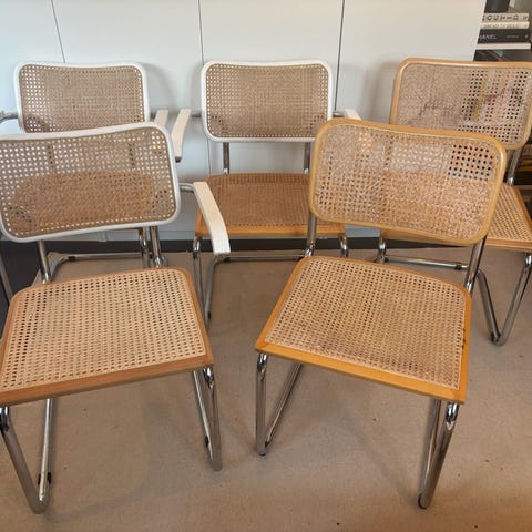 4 stycken stolar i Bauhaus-modell. 2 av stolarna är i bra skick och 2 har slitage. Se bilder för visst slitage på 2 av stolarna på träet och rottingen.