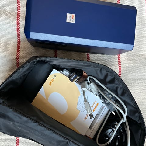 Imacon Flextight digital filmskanner. Utrustningen på bilden inkluderar skannerenhet, filmhållare/ram samt externa tillbehör som batteripack och minneskortsförvaring. Produkten är avsedd för digital inskanning av film och dior för vidare bildbehandling i dator. Exakta tekniska specifikationer som upplösning och anslutningar framgår inte av underlaget och bör kontrolleras mot manual eller tillverkarens information.
