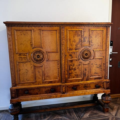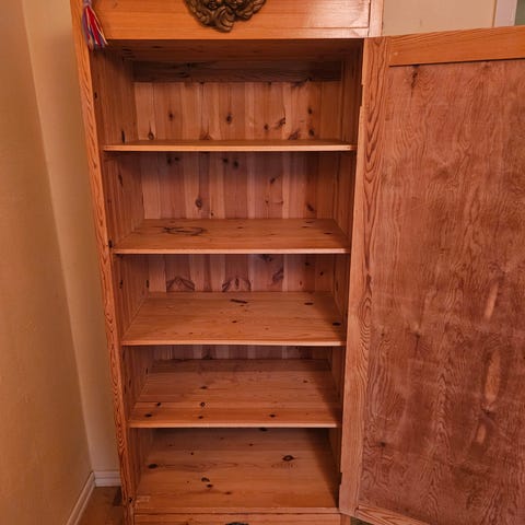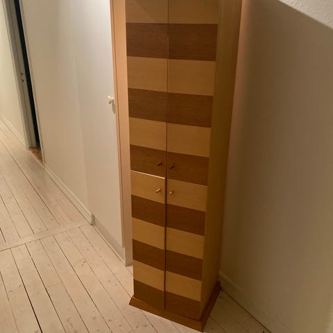 Skåp i trä med dubbeldörrar.