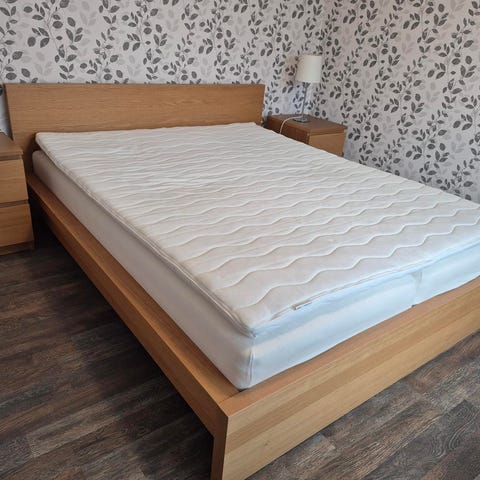 &Tradition säng med madrasser i vit färg. Sängen har en hög gavlar och paneldetaljer i trä. Två separata madrasser ligger i en gemensam sängram, vilket ger möjlighet till individuell komfort på varje sida.