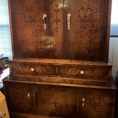 Skåp i brun träfinish med tre dörrar framtill. Underdel med tre mindre lådor och profilerade ben.